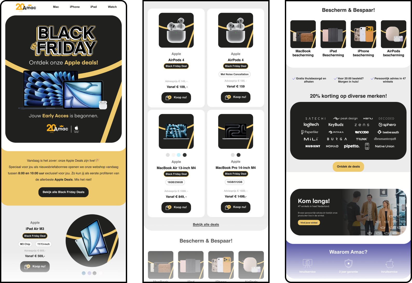 Black Friday is known for shopping madness, loud promotions and endless streams of discounts. Brands flood the market with deals, but rarely with relevance. One discount code after another hits the inbox, without really considering what the customer is actually looking for at that moment. The result: noise instead of impact.For Amac, we set out to explore how to make Black Friday smarter and more customer-centric, with a clear focus on activating new customers rather than bombarding the existing database yet again.